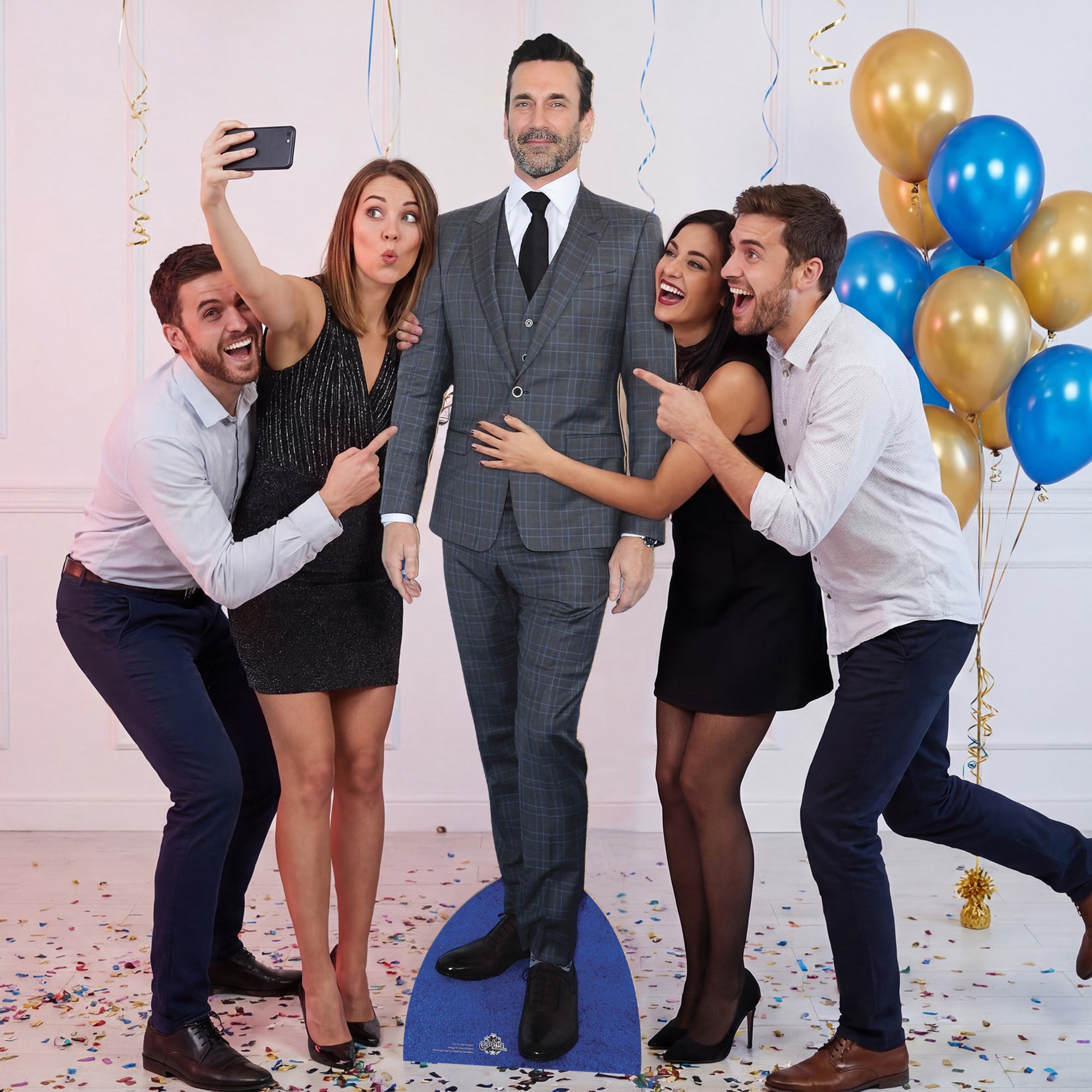 Dress your event in style with this lifesize Jon Hamm cardboard cutout, standing 188 cm tall and featuring a sharp suit look. Best known for his role as Don Draper in Mad Men, Hamm is synonymous with timeless style and screen charisma.