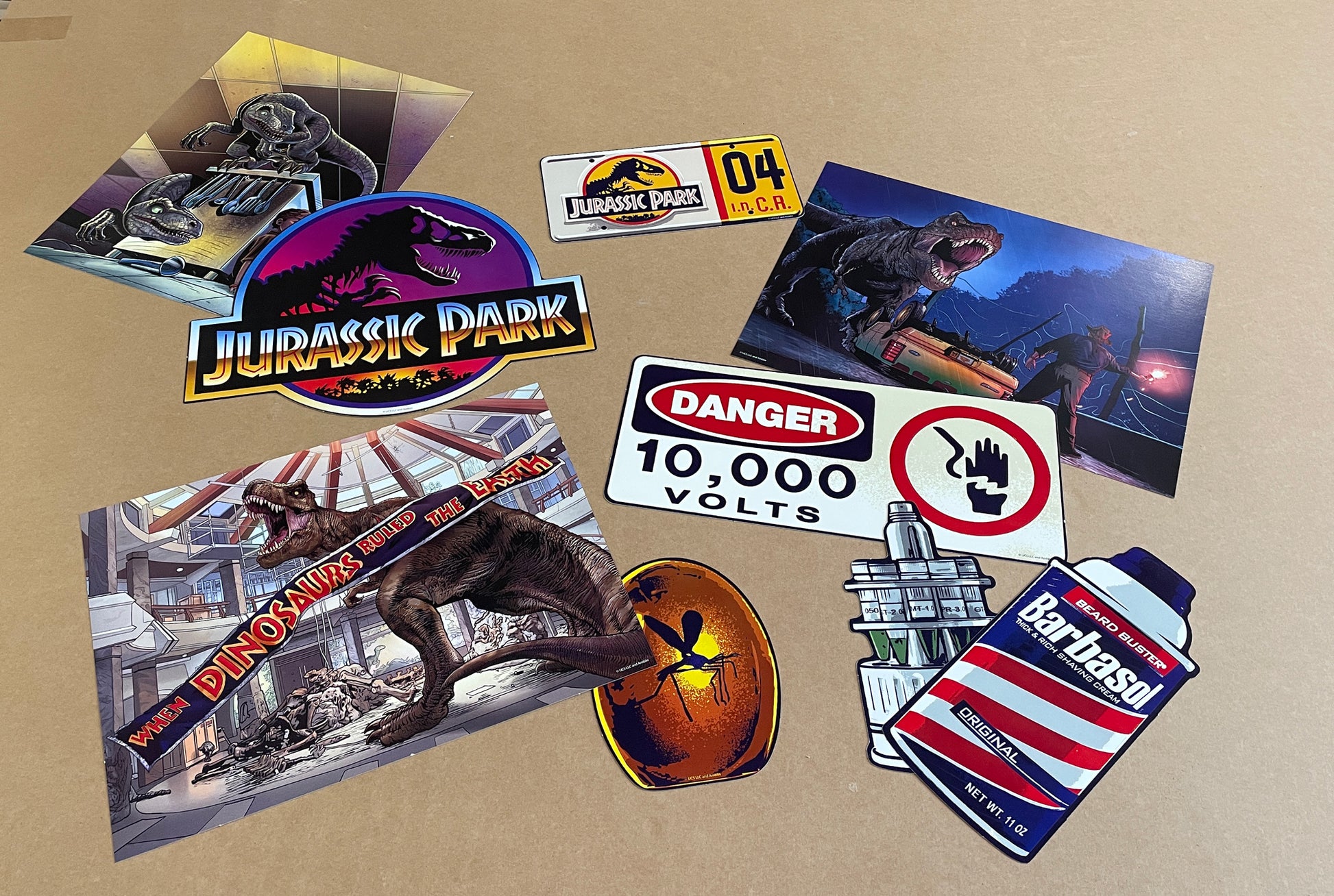 Includes a bold purple Jurassic Park logo, a 10,000 volts high-voltage sign, the unforgettable Barbasol can, and the legendary mosquito in amber – all nods to the most memorable movie moments.