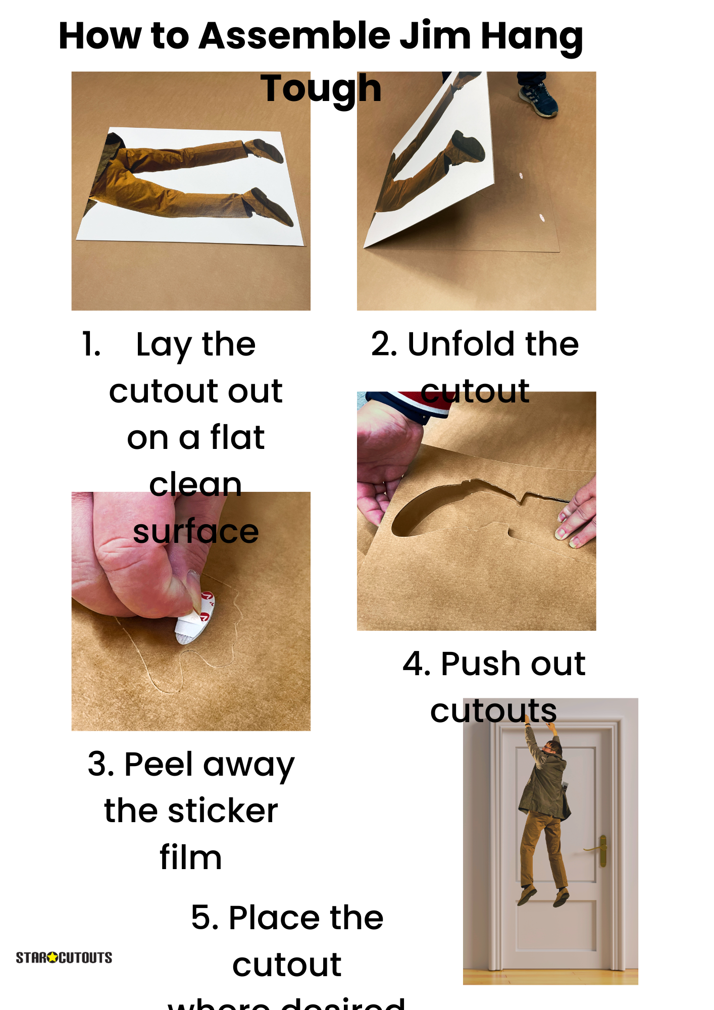 ✨ Easy to Set Up – Assembling the cutout is a breeze. Simply stick it where you want to surprise guests with Jim's classic "Hang Tough" style.