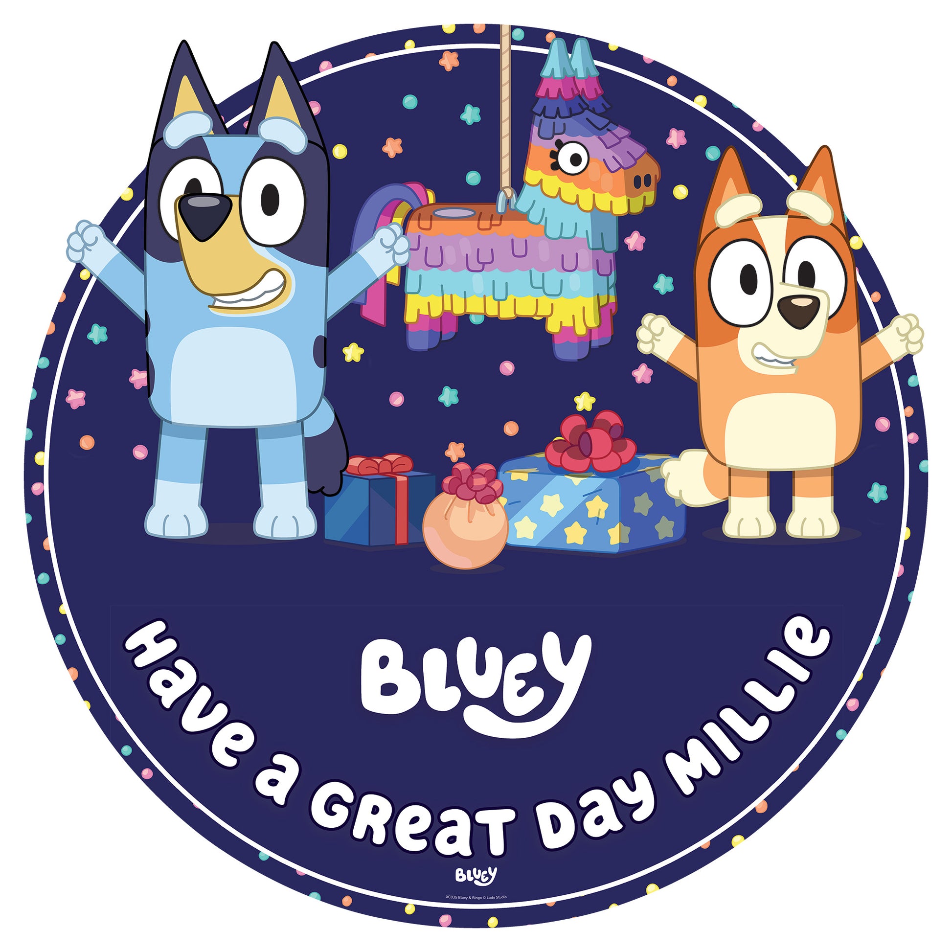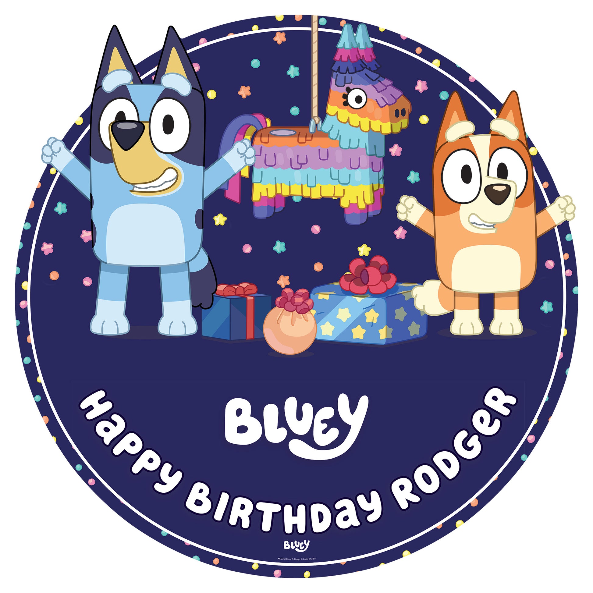 🎉 Make every celebration feel extra special with this official Bluey personalised sign. Bursting with energy, it features Bluey and Bingo having the time of their lives, playing with a piñata under a sky full of bright, colourful stars. The gorgeous purple backdrop creates the perfect scene for birthday fun, photo opportunities, and joyful memories.